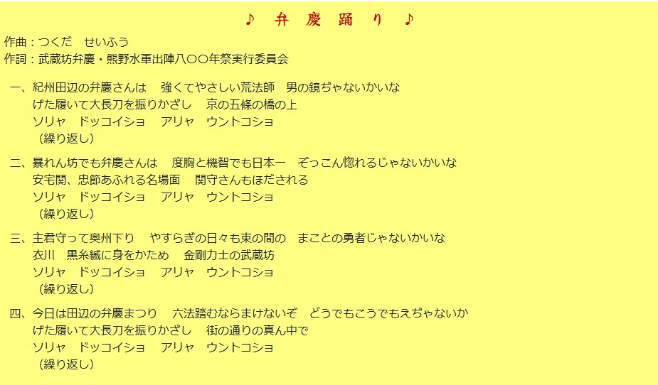 「弁慶ゲタ踊り」の歌詞は、和歌山県田辺市の弁慶まつりで踊られる、弁慶の豪傑ぶりを表現した勇壮な歌で、「紀州田辺の弁慶さん」「げた履いて大長刀を振りかざし」「ソリャ ドッコイショ アリャ ウントコショ」といった威勢の良い掛け声と、主君を守り衣川で壮絶な最期を遂げるまでが歌われています。