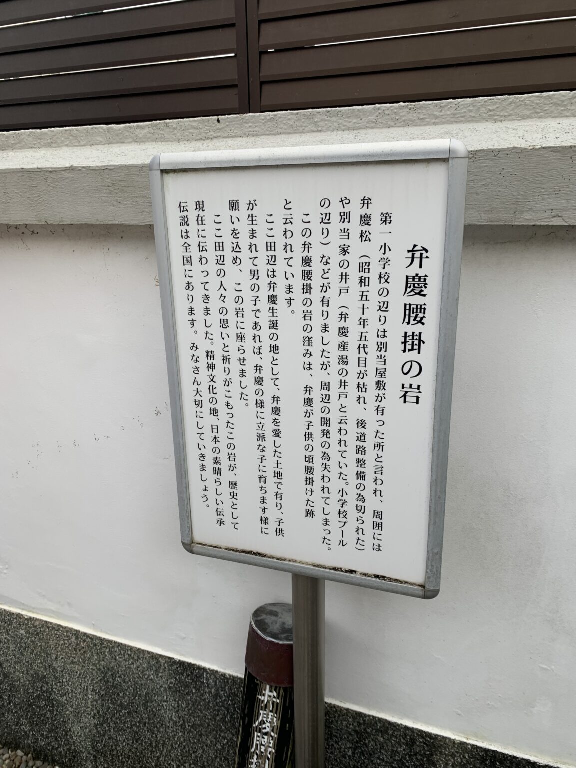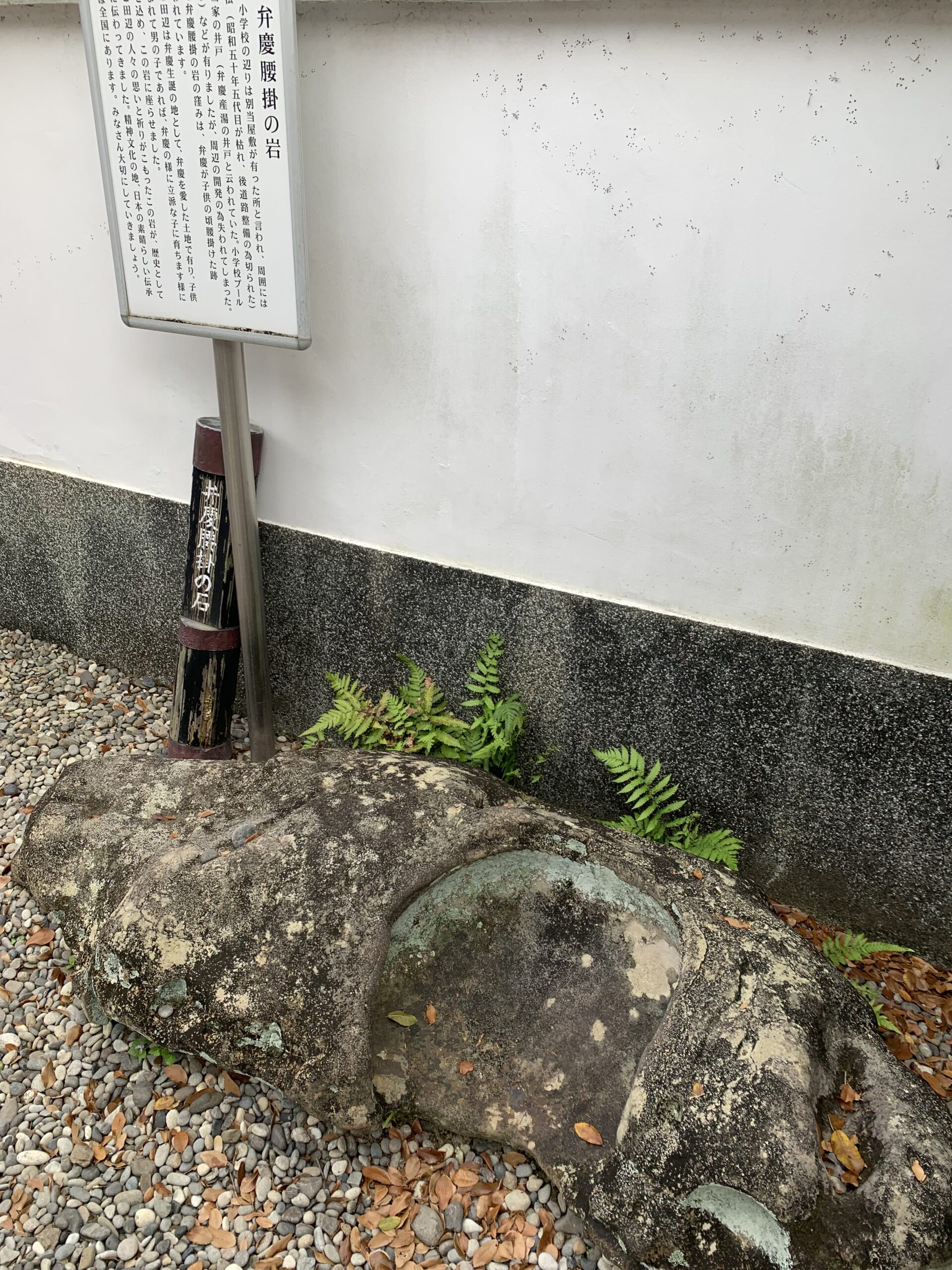 田辺市第一小学校の北側、運動場のでたところまん前にあります、ここにある「弁慶腰掛の岩」。